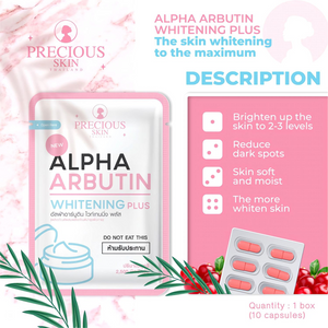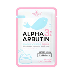 Precious Skin Alpha Arbutin 3+ Collagen Whitening Capsules are a topical skincare add-in designed to help improve the appearance of skin brightness and texture. Each capsule contains a blend of Alpha Arbutin, collagen, niacinamide, vitamin C ester, glycolic acid, and kojic acid dipalmitate to support smoother and more even-looking skin.