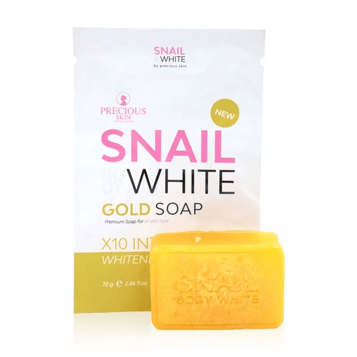 Snail Body White Gold Soap by Precious Skin is the facial and body cleansing soap. Enriched with Snail Slime Extract and Pure Gold, it helps cleanse skin thoroughly, helps soothe dry skin, and reveals naturally glowing and radiant skin.