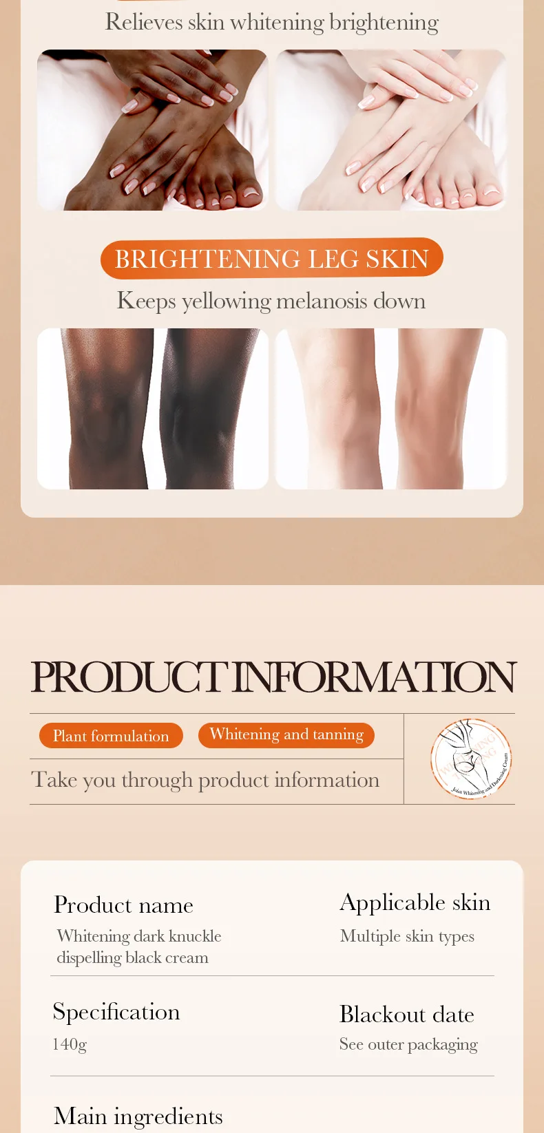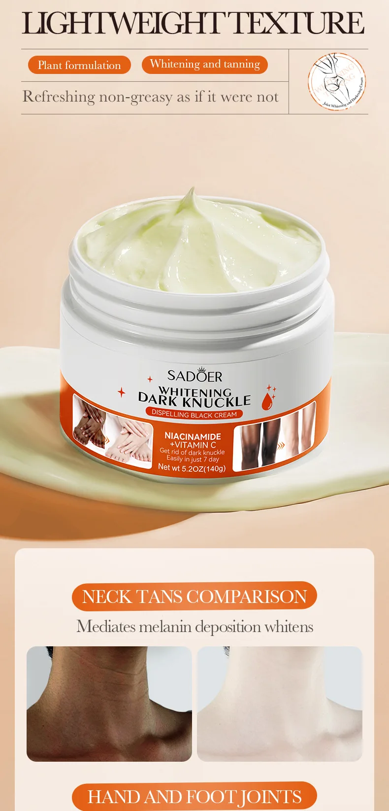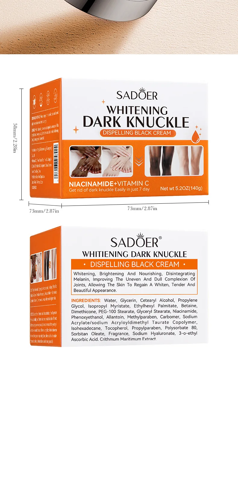 Experience radiant, hydrated, and nourished skin with SADOER Whitening Dark Knuckle Cream, specially formulated to target dark, rough areas such as knuckles, elbows, knees, and ankles. Its rich yet fast-absorbing formula helps restore softness and improve overall skin texture with regular use.