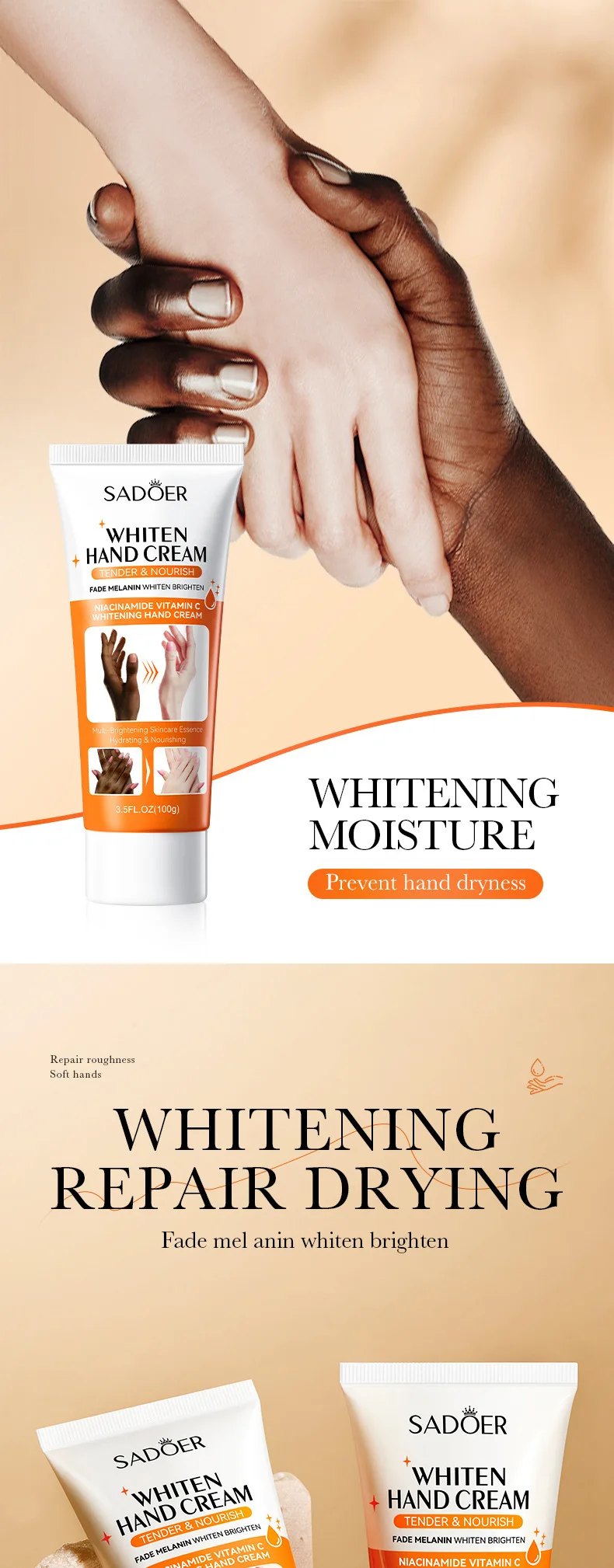 Give your hands the care they deserve with SADOER Vitamin C Hand Cream, specially formulated to whiten, moisturize, and deeply nourish the skin while helping to prevent dryness and chapping. Its rich yet non-greasy creamy texture absorbs easily, leaving your hands soft, smooth, and refreshed.