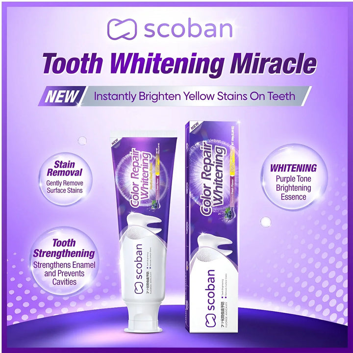Brighten your smile in seconds with Scoban Color Repair Whitening Toothpaste. This innovative formula uses optical color-correction technology to neutralize yellow tones instantly, delivering a visibly whiter smile after the first use. Enriched with fluoride and gentle micro-polishing crystals, it removes surface stains caused by coffee, tea, and smoking—while protecting enamel and leaving your mouth minty fresh.