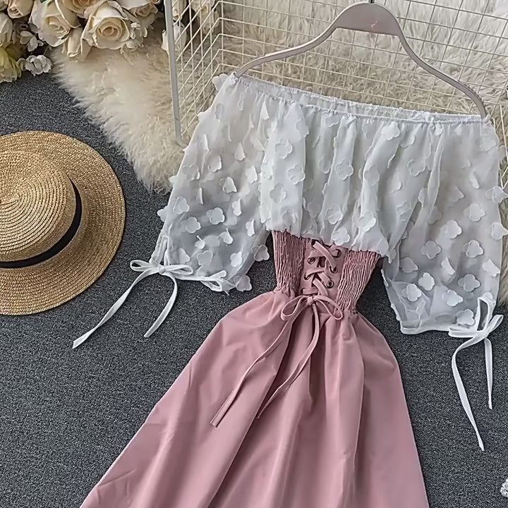 Slash Neck Solid Chiffon Puff Sleeve Flower Party Dress