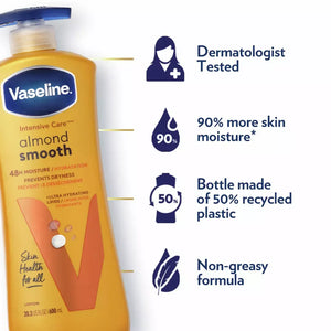 - Vaseline Intensive Care Almond Smooth Body Lotion is clinically tested to provide 90% more skin moisture vs. untreated skin