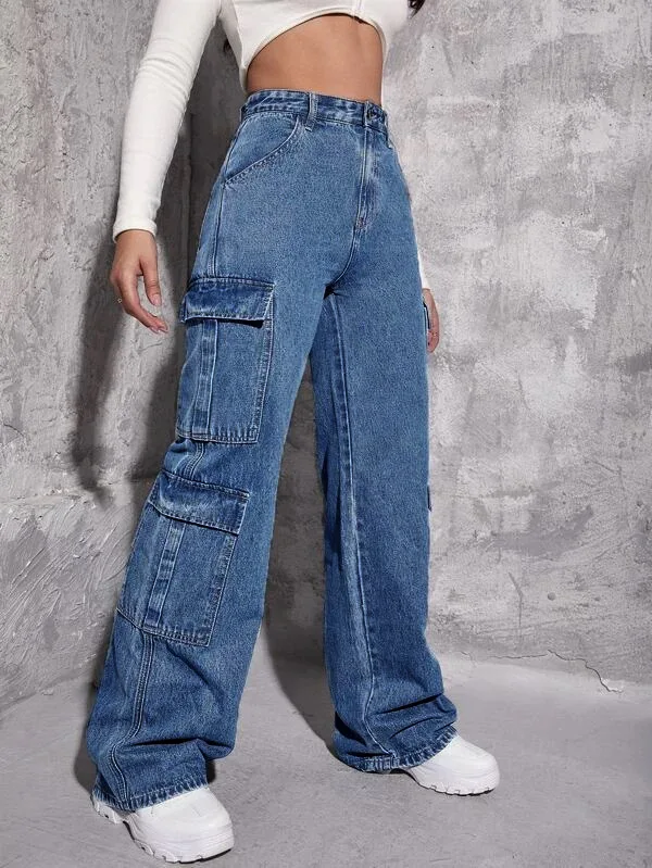 Women's Stylish Denim Cargo Pants With 8 Pockets - 6680#