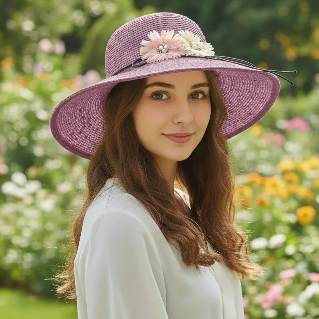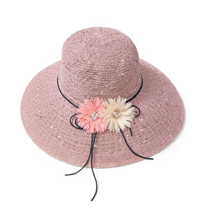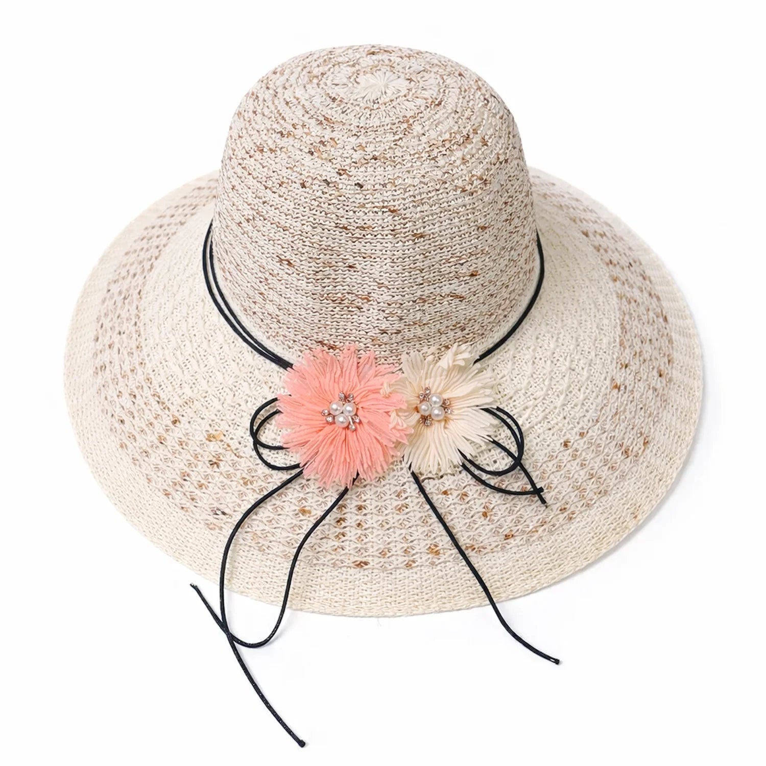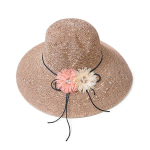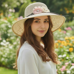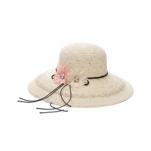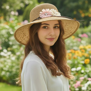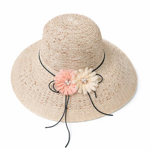 Women's Wide Brim Straw Sun Hat with Flower & Pearl Trim