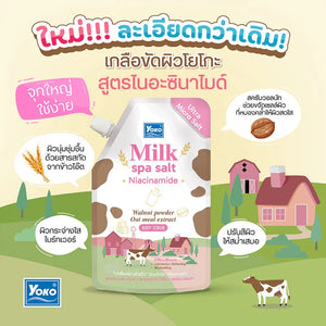 Yoko Gold Milk Spa Salt Niacinamide 350g New formula spa salt scrub with a smooth and fine texture, small salt grains that do not irritate the skin. In addition to the main extracts from natural salt, milk protein and Vitamin E, it is also packed with oat and walnut extracts that gently exfoliate the skin and maintain skin moisture, along with Niacinamide that helps adjust skin tone to be even, giving the skin a smooth, soft, radiant and healthy look.